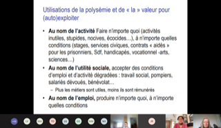 Subject to quantitative goals, rigid procedures and frequent reorganizations, employees often feel that their work loses meaning. How do they respond to these difficulties? Do they want to leave in search of a better job? What is the relationship between the change in the meaning of work and sickness absence? In the work written together with Thomas Coutrot, "Nadanie sensu pracy", as reported by Coralie Perez, we propose an original definition of the meaning of work in relation to the psychodynamics of work. Our results, based on the analysis of the 2013-2016 Universal Working Conditions Survey panel, confirm the interest in taking into account the meaning of work (and the conditions of its performance) to understand employee behavior (mobility, absenteeism) and further to think about ways of emancipation "through" and "at” work.