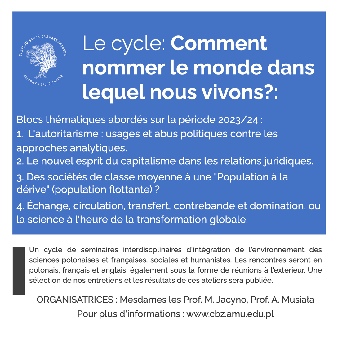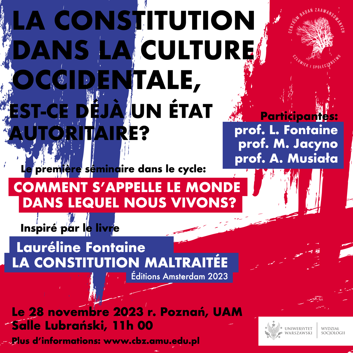 Nous tenterons de répondre à ces questions lors du premier séminaire de la série Comment nommer le monde dans lequel nous vivons? Avec le professeur Lauréline Fontaine, auteur du livre: La Constitution maltraitée, préface Alain Supiot, et Madame La Professeur Małgorzata Jacyno, sociologue de l’université de Varsovie.